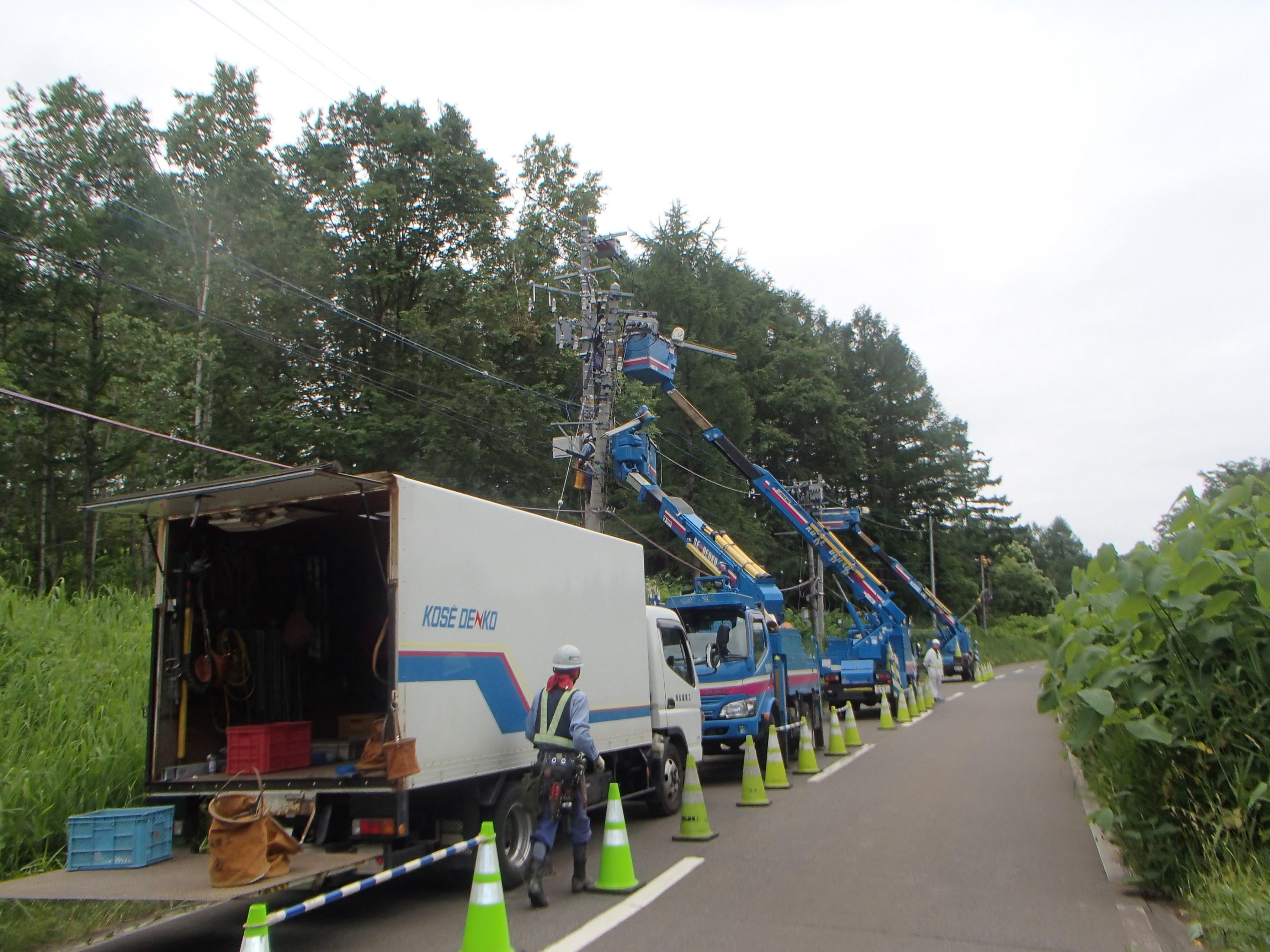 電柱に直接昇ったり、「高所作業車」という車両に乗って電線を張ります。既に張ってある電線を新しい電線や太い電線に張り替える工事も行います。